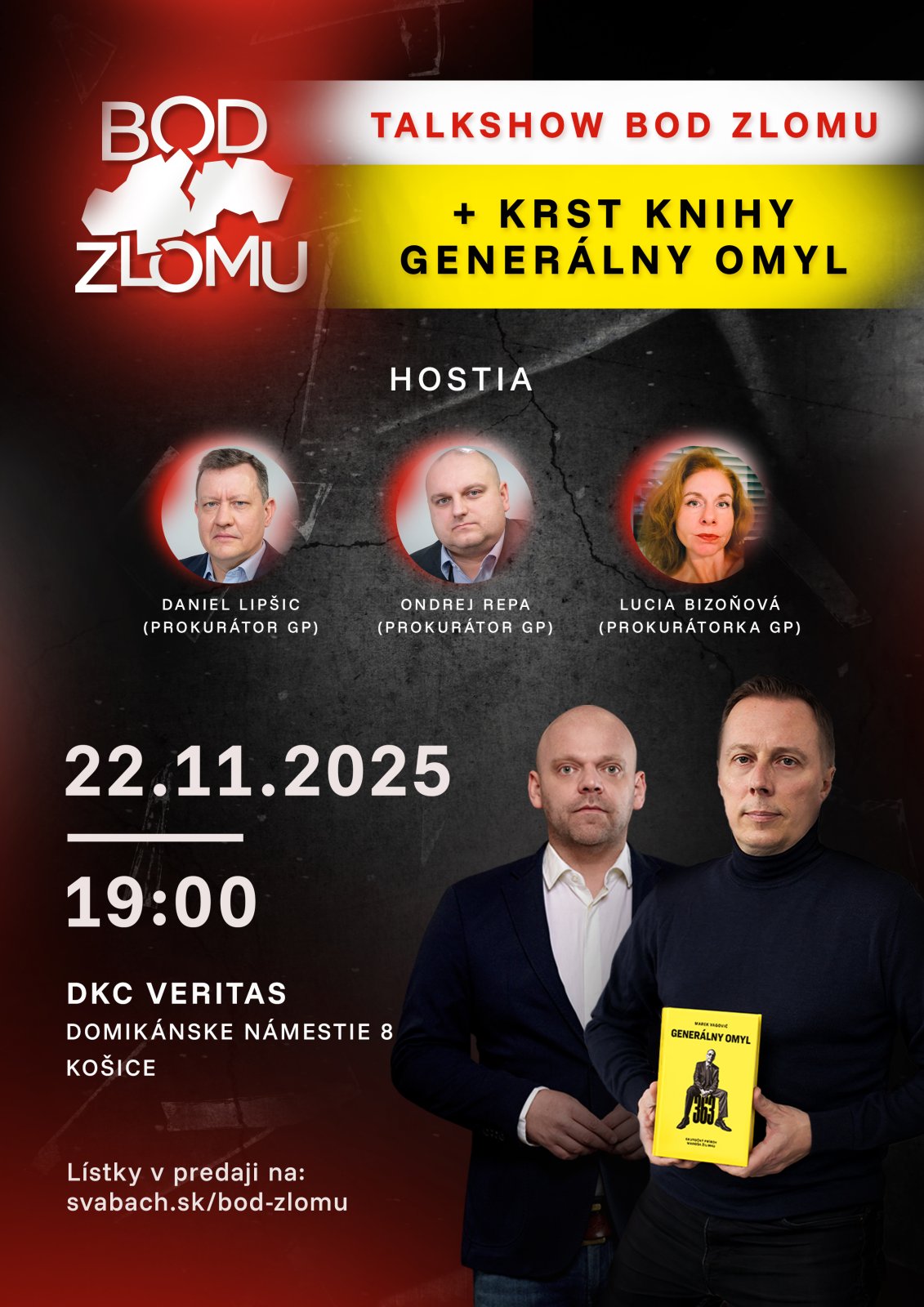Príďte 22. novembra 2025 o 19:00 do košického DKC Veritas a dozviete sa viac. Hosťami talkshow Bod zlomu budú prokurátori Daniel Lipšic, Ondrej Repa a Lucia Bizoňová.