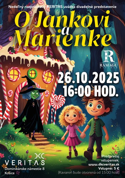 Známy príbeh dvoch veselých súrodencov, ktorých zvedavosť zatiahne až k perníkovej chalúpke, je v inscenácii Divadla RAMAGU obohatený o veselé autorské piesne a interaktívne scény s detským divákom.